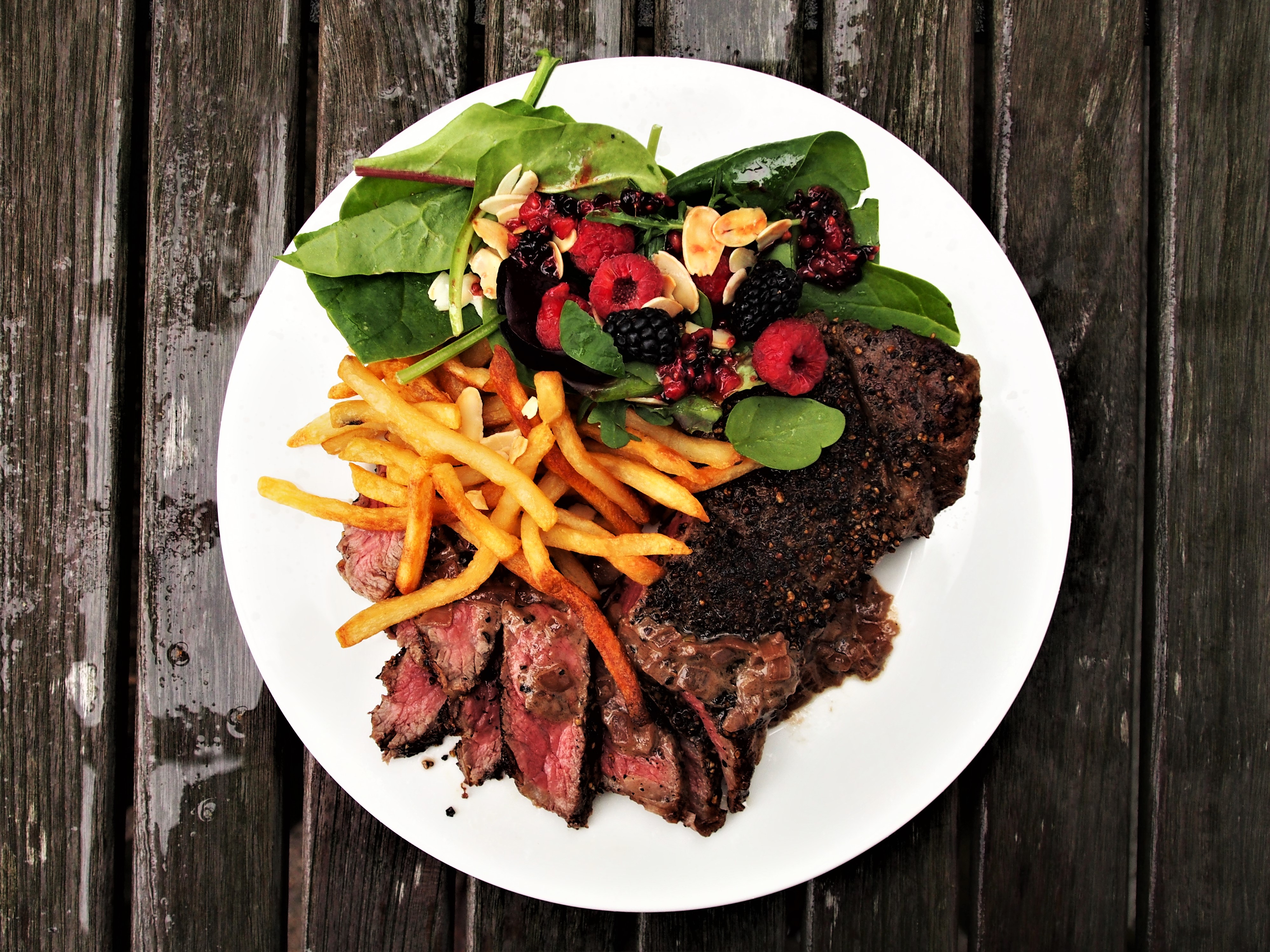 1. Using a mortar and pestle, or the coarsest setting on a pepper mill, crush the peppercorns until coarsely cracked. Sprinkle the pepper evenly on both sides ofthe steaks and press it into the meat using your hands or the flat side of a cleaver blade. Cover and let stand for 30 minutes.
