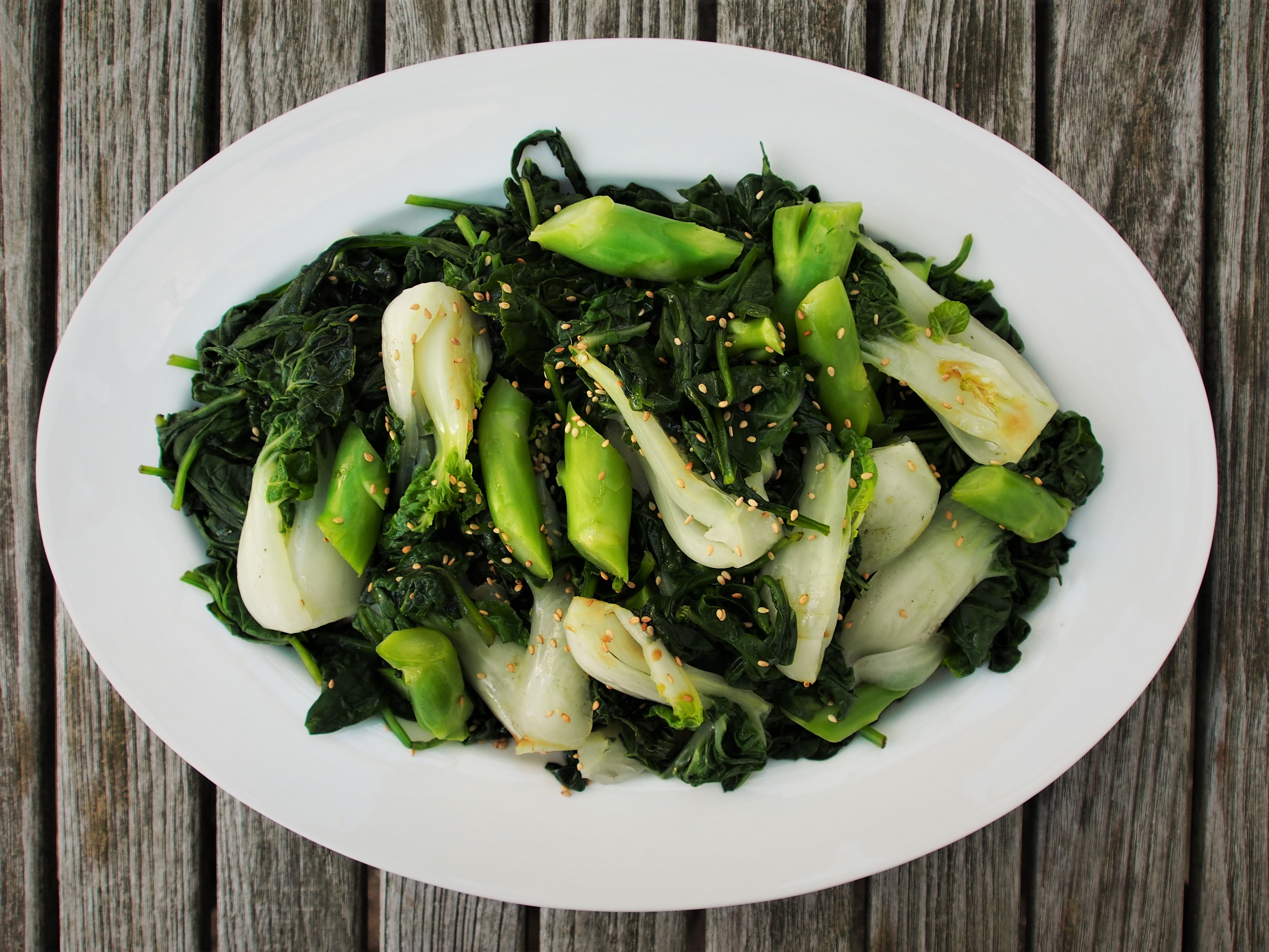 3. Put the cooked greens onto a serving platter, drizzle the dressing over them and toss well to coat. Garnish with sesame seeds and serve immediately.