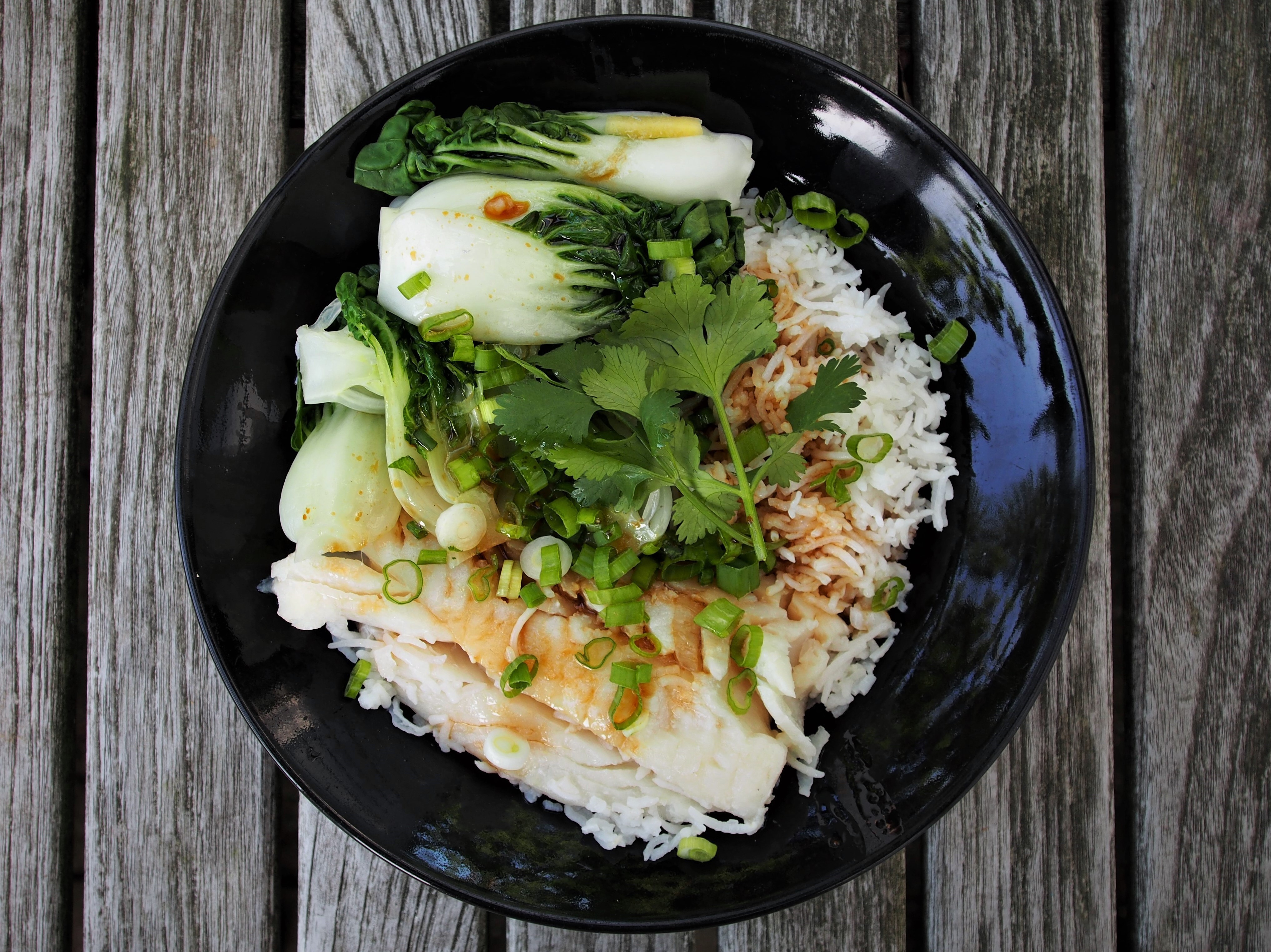 2. Combine soy sauce, sugar and sesame and peanut oils in a saucepan over medium heat for 2 minutes, or until warm. Serve fish and bok choy with dressing, spring onion, coriander and rice.