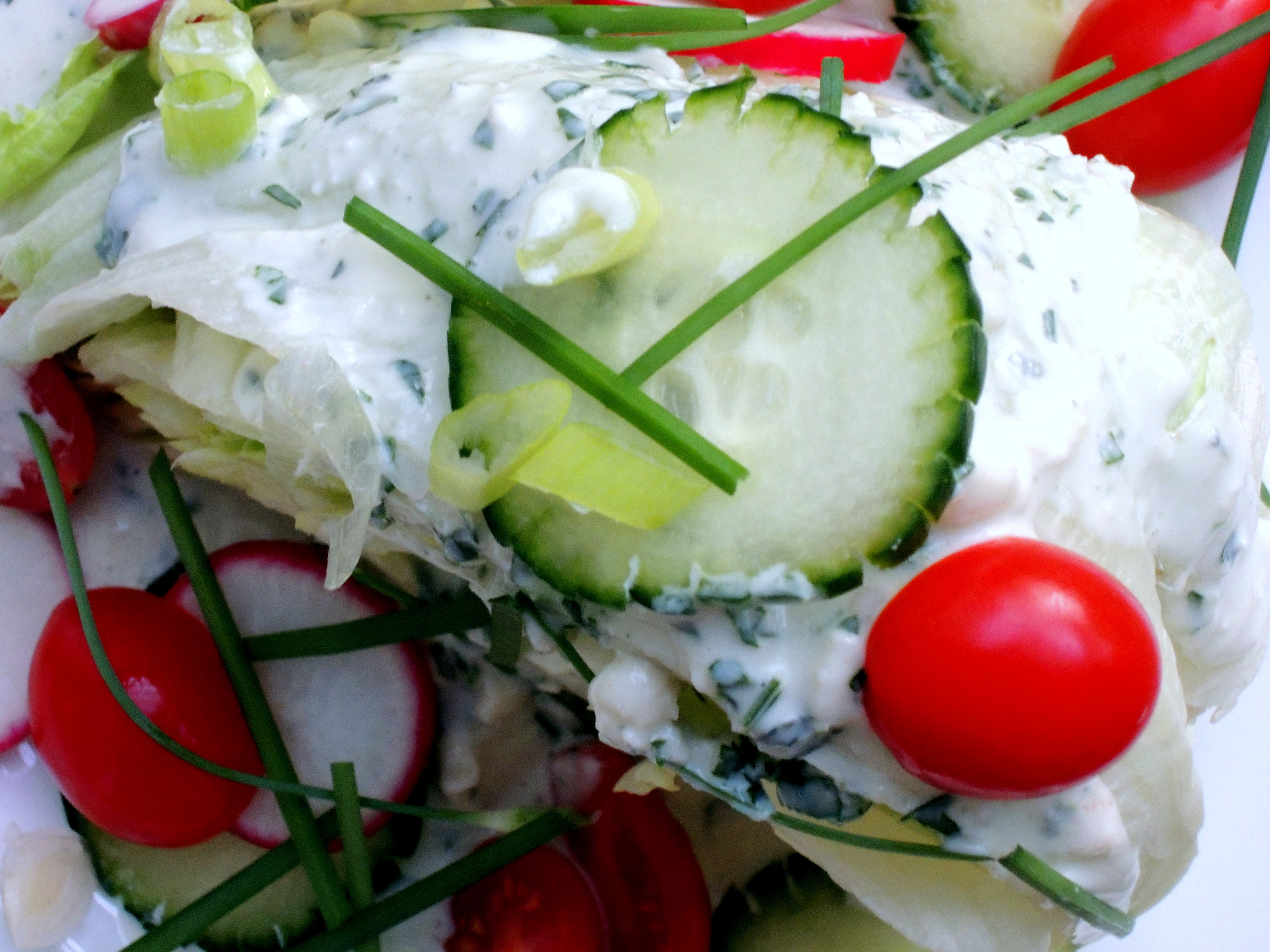 Iceberg lettuce wedge salads were saved from the dustbins of food history when they found a new home in steakhouse chains coast to coast. Served cold and crunchy with a creamy dressing, Americans enjoyed the contrast in texture and found them a perfect precursor to a hot, juicy steak. Fine dining they may not have been, but steakhouse patrons demanded them. And iceberg lettuce also was used in other salads (see the Columbia 1905 salad or the corned beef salad with Thousand Island dressing and rye croutons), not to mention as shredded toppings for sandwiches and tacos, or as lettuce cups for Asian minced duck or squab. For more emulsions that can be applied to a wedge of iceberg lettuce, see salad dressings under condiments on this site.